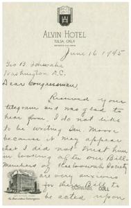 Update on SCHWABE Bill COLL and Congressional Inquiries at ALVIN HOTEL, 1945-01-01 - 1945-12-31