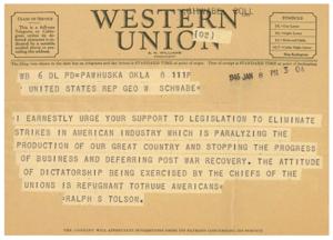 Urgent Support Needed: Legislation To Eliminate Strikes In American Industry, 1946-01-01 - 1946-12-31