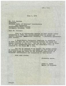 Congressman acknowledges request to support bill extending veterans' benefits., 1974-06-27