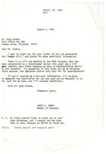 Correspondence between Congressman James R. Jones and Ms. Anne Enders Regarding the 'Wester Bill', 1983-08-05