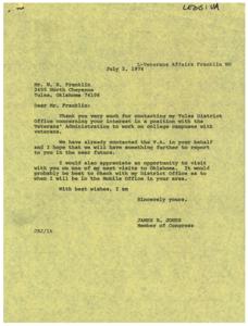 Disabled veteran seeks VA job on college campuses, aided by Congressman., 1974-06-24